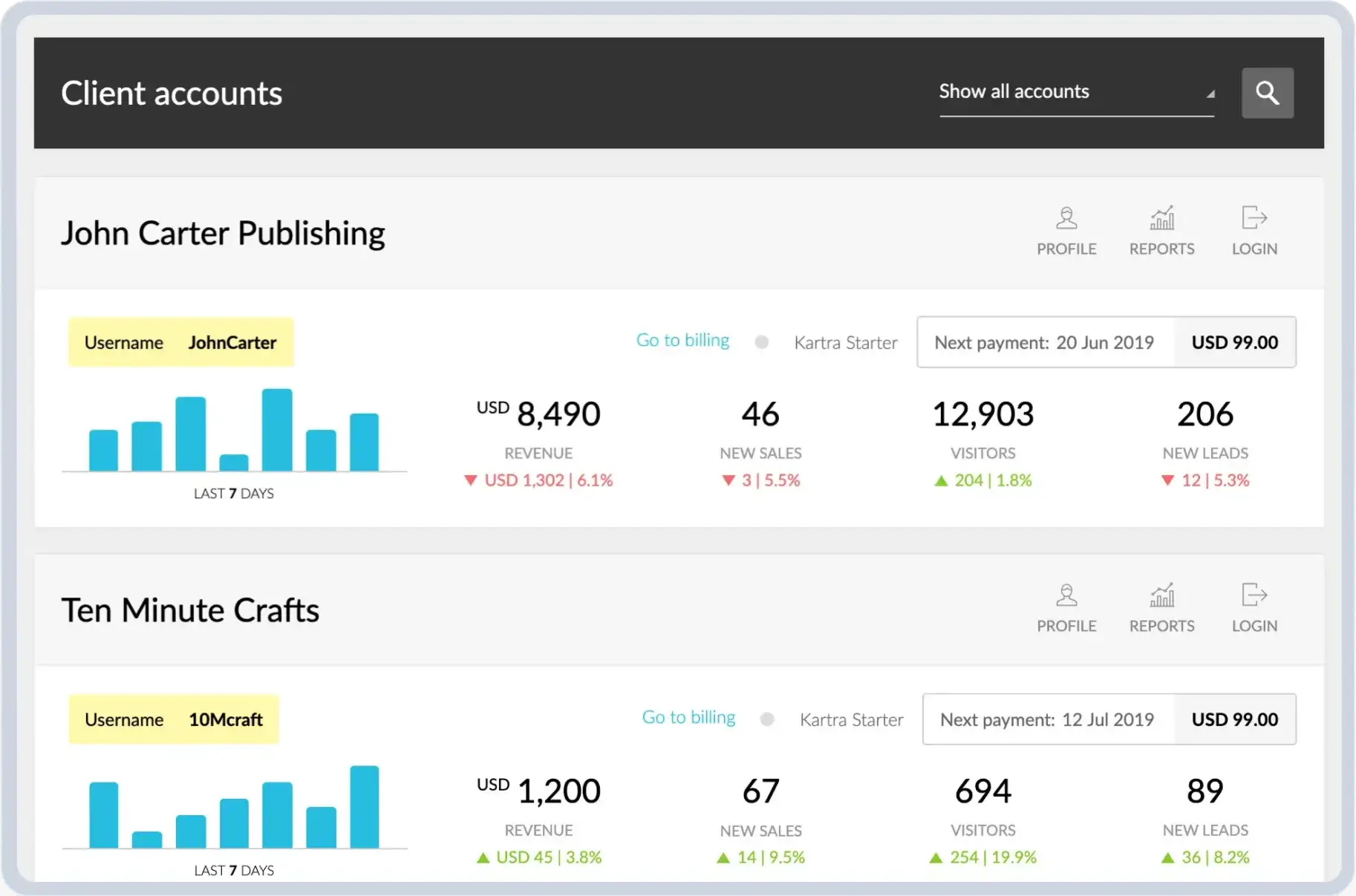 To help you in this regard, Kartra Agency automatically generates a segregated report, on an account by account basis, where your clients will see their account sales, revenue, page visitors, leads generated, etc. Best part: it updates in real time and they can refresh it as often as they like, liberating you from the data-crunching chore!